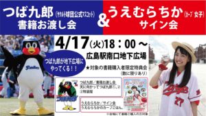 つば九郎は2018年に、広島駅南口の広島駅南口地下イベント広場でつば九郎(ヤクルト球団公式マスコット)書籍お渡し会&うえむらちか(カープ女子)サイン会を開催しており、その日も大勢の人が詰めかけていて、広島でもその人気の高さが伺えるイベントになっていた。(ひろスポ!取材班”カーニャが行く”)