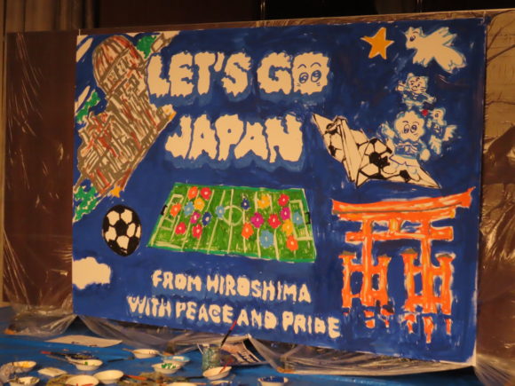 ヴィオラ奏者で「マイ・ハート弦楽四重奏団」を率いて2,000回以上のトーク&コンサートを開催してきた沖田孝司さんの独奏、ヒロマツホールディングスが企画・運営する広島の新たなアート拠点「ART BORN HIROSHIMA」所属のアーティスト、宮本拓也さんと大沼寛明さんによる作品創作、令和歌謡グループTEPPANのメンバー4人によるショータイムがあった。スぺシャルゲストの金田喜稔氏も、森保ジャパンに熱いエールを贈った。