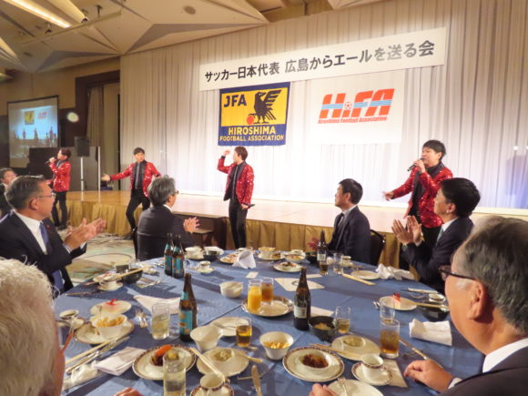 サッカー日本代表へ広島からエールを送る会(世話人 公益財団法人広島県サッカー協会 会長 宗政潤一郎)が4月23日、広島市内で開催され、およそ300人が集まった。2026FIFAワールドカップに出場するサッカー日本代表の森保一監督らを、広島の関係者、サポーターらがさまざまな形で激励した。