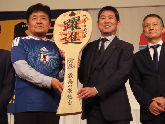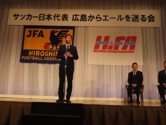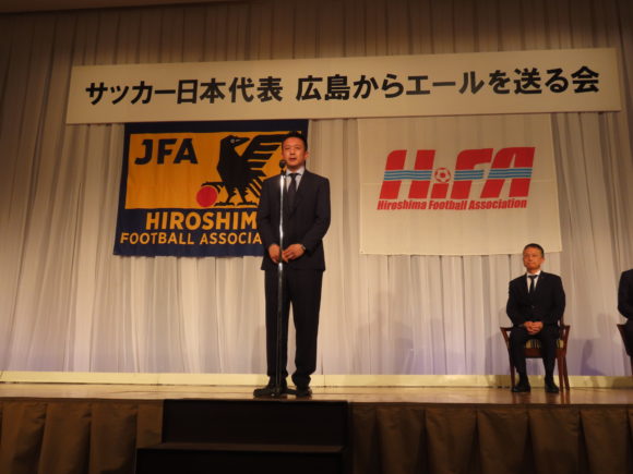 森保一監督 改めまして、本当に広島県サッカー協会の皆さん、そしてこのような素晴らしいエールを送っていただいたり、ご期待していただき、本当にありがとうございます。 そして広島市、広島県内のサッカー協会の皆さん、そして市民の皆さん、県民の皆さんの方もたくさん来ていただき、本当に最高のエールをいただけました。